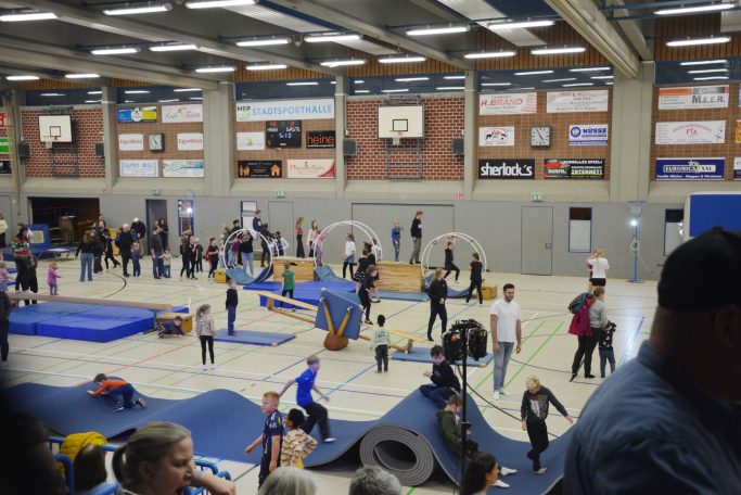 Damit nicht nur zugeschaut wird, gibt es außerdem eine Mitmachaktion für Groß und Klein. Besonders beliebt ist der Bereich Turnen & Rhönradturnen, bei dem jeder selbst aktiv werden und Neues ausprobieren kann.